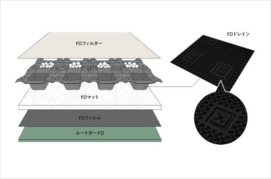 1枚の立体構造パネルに保水・排水・通気機能を一体化したのがFDドレイン。1枚のパネルが3つの役割を持つことで、大幅に軽量化されているうえ、それぞれの層としての機能も向上しています。