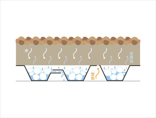 表面の凹部で保水し、オーバーフローした余分な水は、パネルとパネルの隙間から下層部に流れ落ちていきます。パネルの裏側では、躯体勾配に沿って流れる水がルーフドレインを抜けていき、排水層として機能。さらに、立体構造により生まれる空隙部が通気層としての役割を果たします。