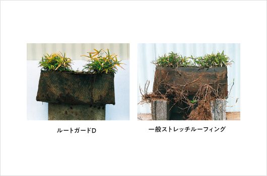 根の進行を防ぎきれない一般ストレッチルーフィングに比べて、ルートガードDが高い耐根性能を有していることが分かります。