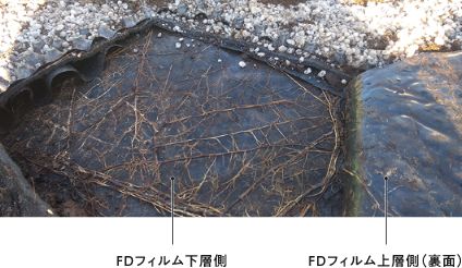 左は施工28年経過した植栽を撤去後、FDフィルムの重ね部分(1m幅)をめくった場面です。太い根が張っていますが、フィルムは貫通していませんでした。