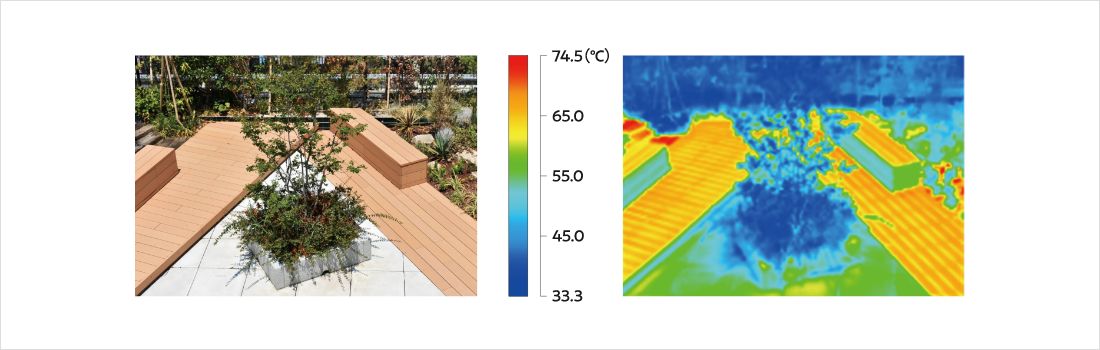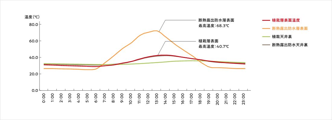 屋上を緑化すると水分が蒸発し地表の熱が奪われるため、特に夏場の建物においては緑の日傘(遮熱)効果が見られます。