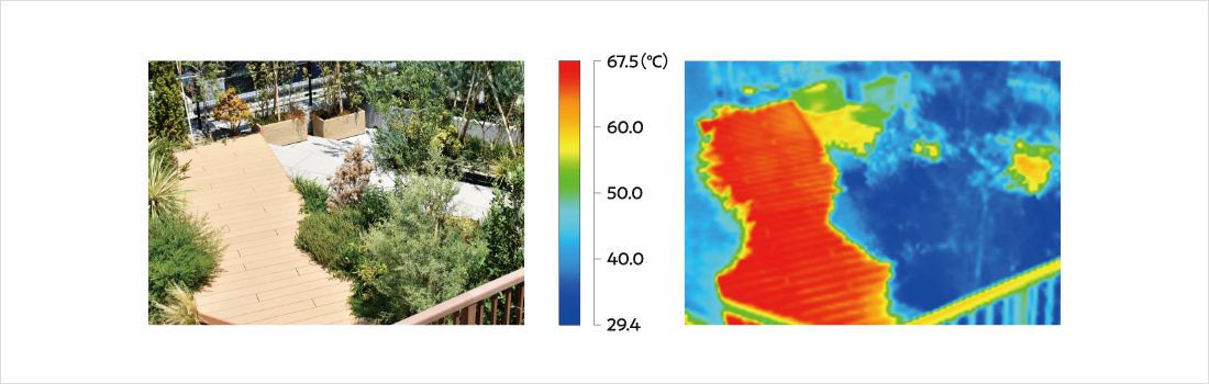下の実例①では、赤外線サーモグラフで見ると緑化していない屋根の表面温度は約68.3℃に対して、緑化部分の表面温度は40.7℃前後を推移しており、27.6℃近い温度差があることがわかります。特に効果が見られる屋上直下のフロア(天井裏)では約2.0℃の低下が見られます。
