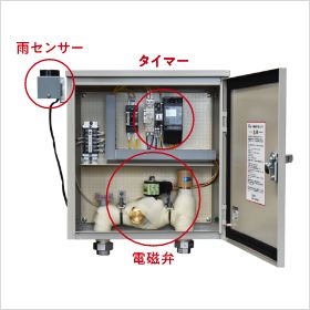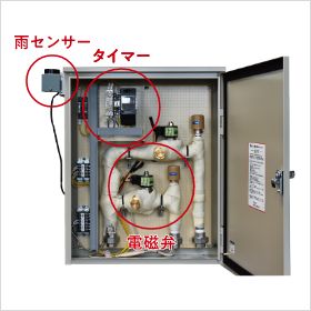 | システムセット内容 | 年間式タイマー/漏電ブレーカー/逆止弁付きボールバルブ(凍結防止用ヒーター※)/ ストレーナー付電磁弁/吸気弁/ユニオン/ステンレス製ボックス ※気温3℃で作動 |