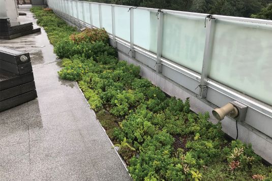 排水ドレン廻りにゴミ等の堆積がないか点検します。そのまま放置すると排水不良を起こす懸念があるため、ゴミ等の堆積物が見られた場合は除去します。特に台風、低気圧通過などの強風・大雨の翌日以降早めに状況確認を行い、植物や土壌、周辺部材の飛散、倒壊がないかチェックを行います。また、緑化帯廻りが露出防止層の場合、防水層の表面に異常が見られた場合は管理会社又は防水施工業者までお問い合わせください。