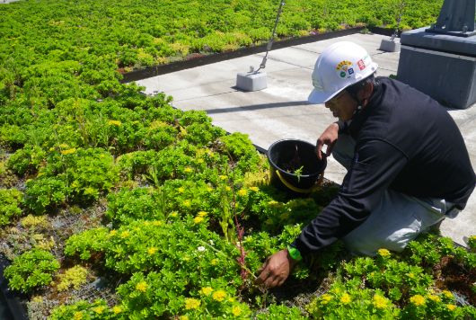 屋上緑化の設置後には種子が飛来し、雑草が生えてきます。雑草は新芽前や種子を落とす前、雑草が生えやすい梅雨、初夏〜秋頃に緑化帯を点検し、根元から引き抜くように取り除きます。