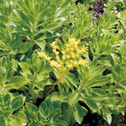太い根茎から肉質で丸い茎を伸ばし、高さ5~30cmまで成長します。鮮緑色の葉の縁には先の丸いギザギザがあり、5~8月に茎の先端に黄色の花が輪のように咲きます。冬に落葉する従来のキリンソウとは異なり、春と秋の年に2回新芽を出し、交互に成長を続けていきます。