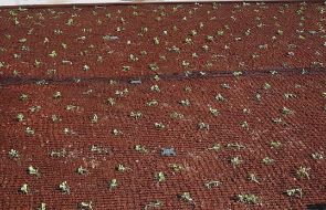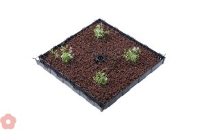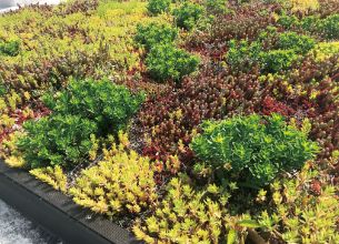 薄い土壌でも生育し、多量の水分を必要としないセダムは、屋上緑化に適した植物といえますが、万能ではありません。保水排水層などの植栽基盤を設置しても、直射日光が照付け、降雨がない渇水期間もある屋上では、環境の変化により植物が一気に衰退する危険性があります。そこでこのような事態を避けるため、ドイツでも広く実践されているのが、個々の屋上環境に適した植生となるように複数種のセダムを混ぜて植える「混植」です。田島ルーフィンググループでは、4品種の混植を標準としています。