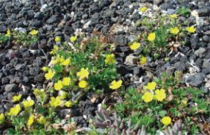 地を這う茎は紅色を帯び、黄色の花をつける。冬季は落葉。